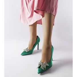 Adăugați strălucire la stilizările dvs. datorită tocurilor verzi. Nasul ascuțit și pinul înalt de 10 cm subțire, iar finisajul din satin oferă pantofilor un personaj de lux. Un arc subtil decorat cu zirconi subliniază un aspect feminin, elegant, iar tăierea de alunecare garantează rapid și confortabil.