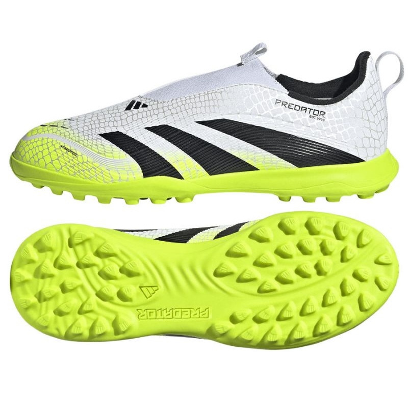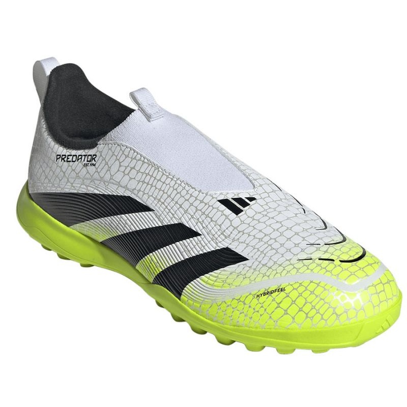 Hibridfeel Upper, fără șireturi ale acestor încălțăminte de tineret, este acoperit cu o textură convexă și echipată cu suprapuneri adezive StrikeScale pe partea interioară a piciorului a fost optimizată pentru precizia împușcăturilor. O talpă exterioară de cauciuc cu proeminențe asigură stabilizarea pe pasul artificial.