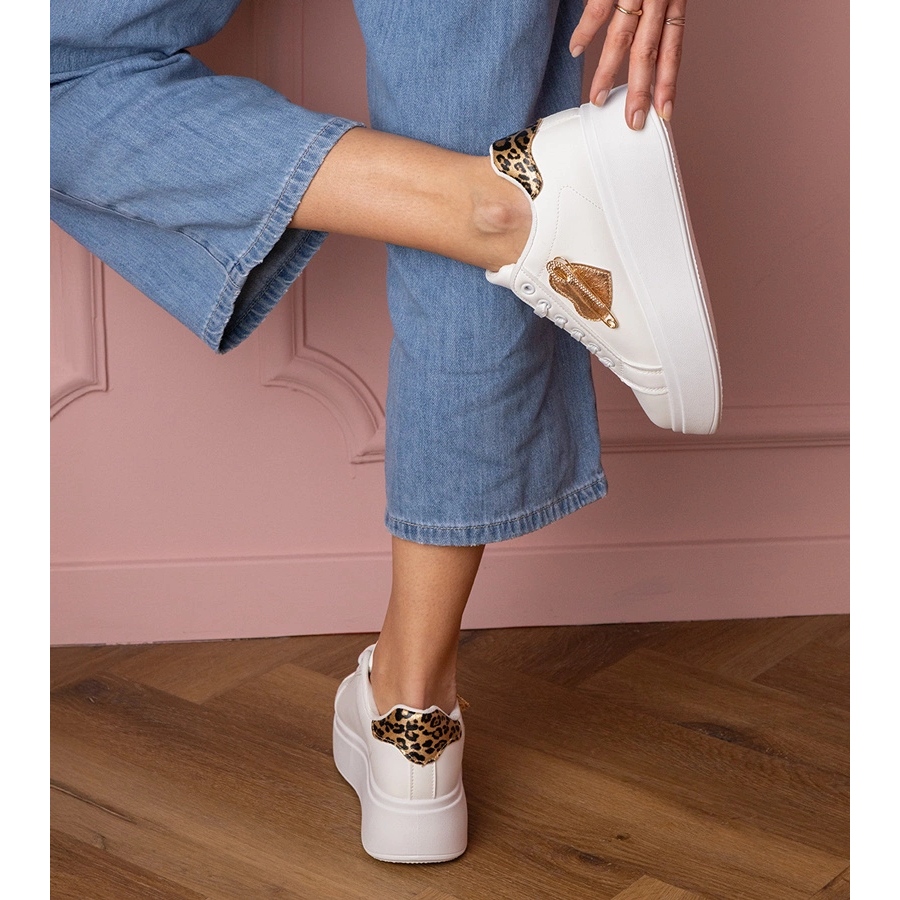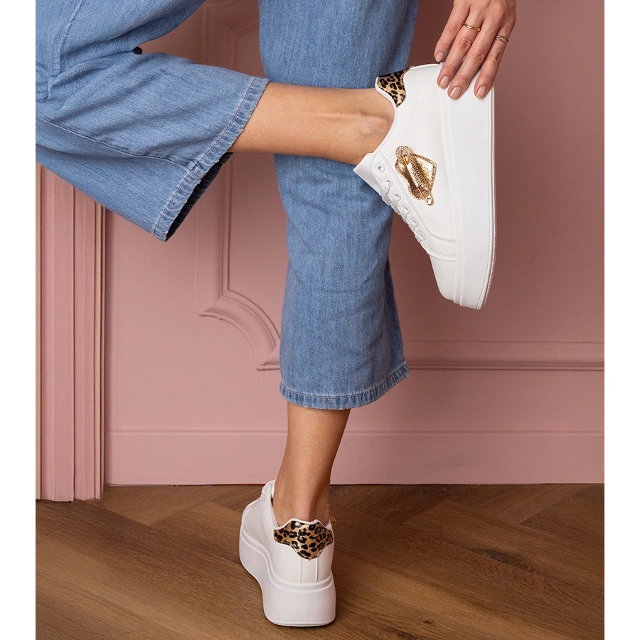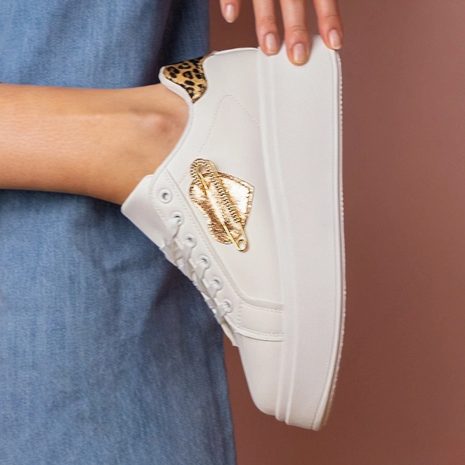 Detalii: Adidași albi cu pini de zircon și un adaos de leopard