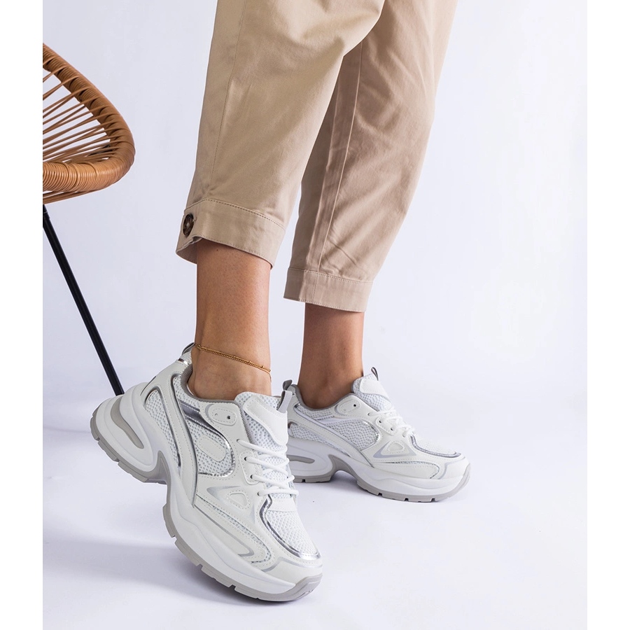 Acești încălțăminte sport pentru femei se disting printr -un elegant superior alb din plasă ușoară (plasă), care asigură o ventilație excelentă și confortul utilizării. O talpă de cauciuc masivă, de 6 centimetri, nu numai că adaugă stil, dar crește și amortizarea atunci când mergeți. Nasul rotund le oferă un personaj sportiv, iar fermoarul dantelat permite o potrivire perfectă a piciorului.