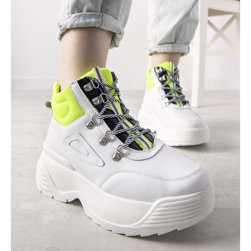 Adidașii cu talpă înaltă Eloquence sunt o alegere perfectă pentru zilele mai reci, combinând confortul și designul la modă. Realizați din piele ecologică de înaltă calitate, acești pantofi albi se remarcă prin inserții elegante într-o culoare neobișnuită verde neon care subliniază perfect glezna.