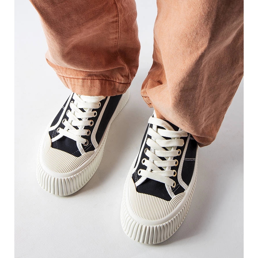Adidași clasici, confortabili, pe o platformă scăzută de 4,5 cm, perfectă zilnic și pentru stilizări de vară. Partea superioară a țesăturii negre, contrastând talpa de cauciuc alb și dantelă formează un aspect atemporal și universal.