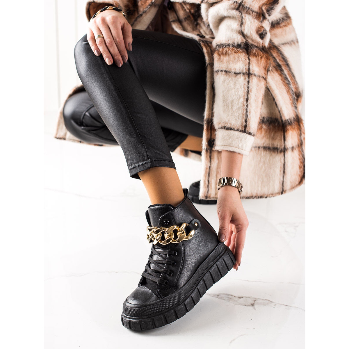 Construcția lor izolată îți menține picioarele calde chiar și în zilele mai reci, iar călcâiul moale, încorporat, oferă un sprijin adecvat. Talpa din plastic cu benzi de rulare garantează o bună aderență, ceea ce le face o alegere excelentă pentru utilizarea de zi cu zi. În plus, lanțul de aur și strasurile le conferă un caracter exclusivist care atrage atenția.