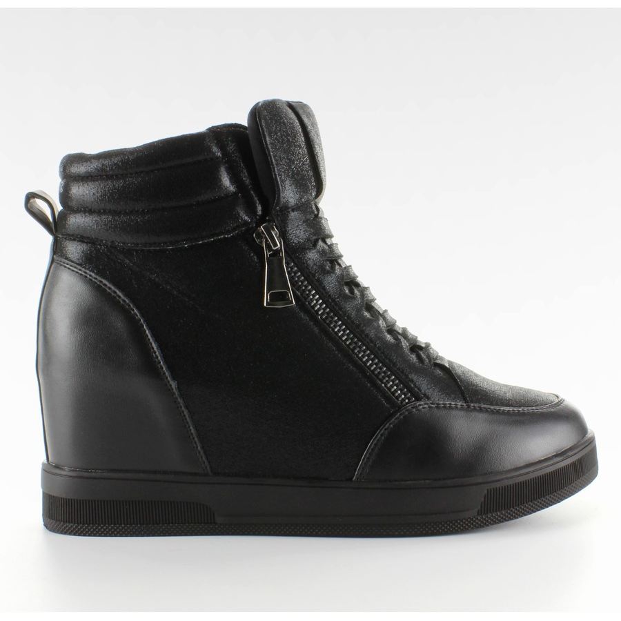 Adidasi R13 - negri, cu pană ascunsă (6,5 cm), combină un caracter sportiv cu o silueta feminină. Partea superioară a gleznei înalte subliniază piciorul, iar pană ascunsă subțiază discret și adaugă câțiva centimetri fără a sacrifica confortul. Șireturile decorative în față oferă un plus de stil, iar fermoarele practice de pe laterale îl fac ușor de pus și scos rapid.