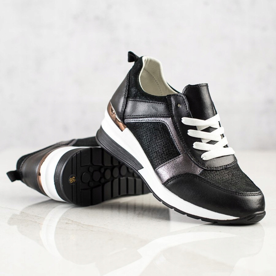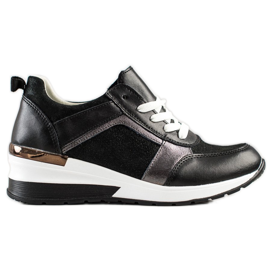 Partea superioară este realizată din piele ecologică neagră de înaltă calitate, care asigură durabilitate și un aspect elegant. Un accent neobișnuit sunt inserțiile acoperite cu sclipici, care adaugă o strălucire subtilă adidașilor. Varful rotund si tocul incorporat, moale asigura o purtare confortabila, iar talpa cu benzi de rulare, din material sintetic, garanteaza o buna aderenta si stabilitate pe orice suprafata.
