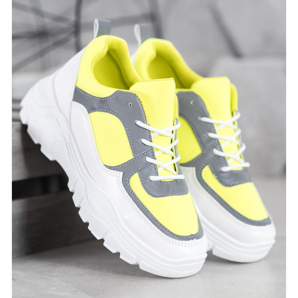 Descoperă un stil unic cu pantofii sport la modă de la Shelovet! Acești pantofi de damă eleganți și sportivi în alb cu accente suplimentare de galben și auriu sunt o alegere perfectă pentru orice ocazie. Se vor potrivi perfect atât în stilul de zi cu zi, cât și în stilul mai casual.