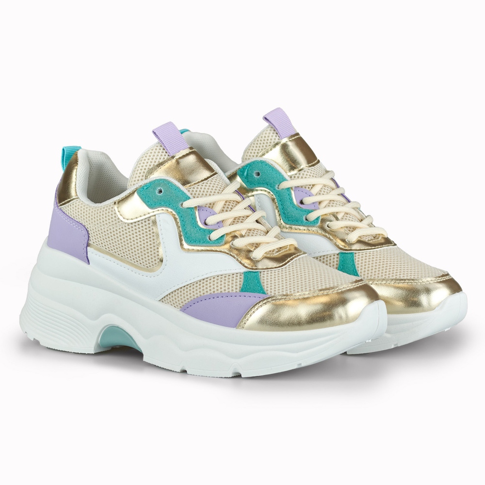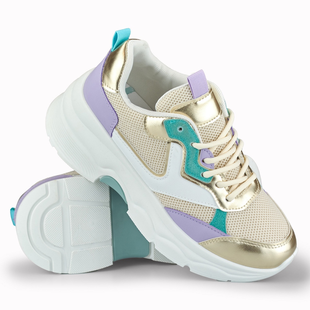 Adidașii Geori eleganți și confortabili de la un alt brand care combină designul la modă, multiplu, cu accente de aur. Partea superioară din materiale ecologice din piele și textilă și platformă de 6 cm adaugă încredere și subliniază figura, menținând confortul pe parcursul zilei. Perfect pentru sezonul de primăvară/vară - pentru stilizări urbane, pentru o plimbare și rezultate casual.
