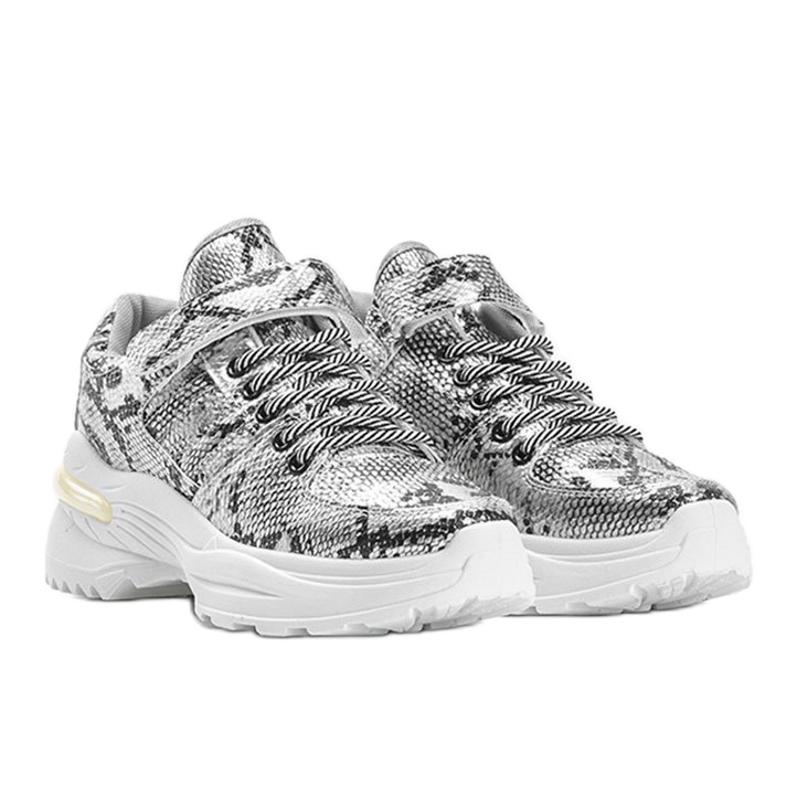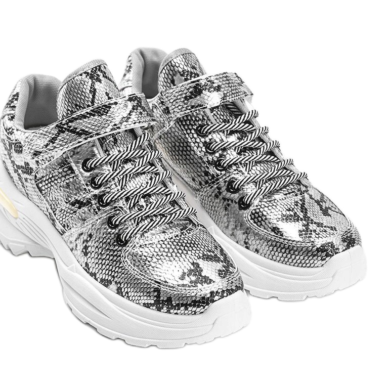Culoarea argintie combinată cu motivul pielii de șarpe le adaugă un pic de exotism și unicitate. Talpa înaltă în formă de pană, de 5,5 cm înălțime, evidențiază frumos silueta, asigurând în același timp stabilitate și confort în timpul purtării. Adidașii sunt șireți și echipați cu o închidere suplimentară cu velcro, care le mărește funcționalitatea și îi face mai ușor de îmbrăcat.