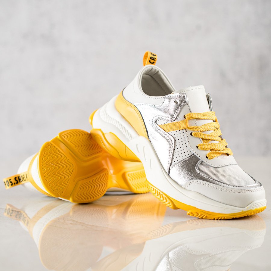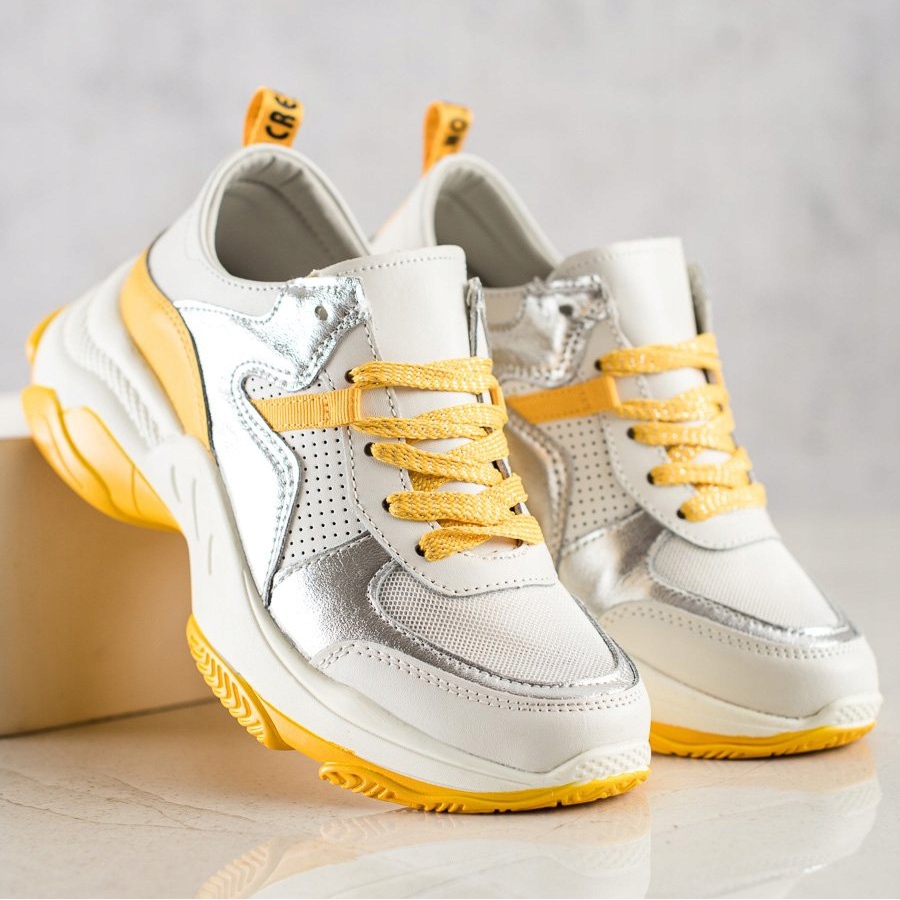 Culoarea dominantă a adidașilor este albul clasic, care a devenit mai expresiv datorită inserțiilor argintii atrăgătoare și accentelor subtile de galben. Aceasta combinatie face ca pantofii sa arate extrem de modern si stilat, iar platforma lor alba cu talpa galbena adauga lejeritate si dinamism.