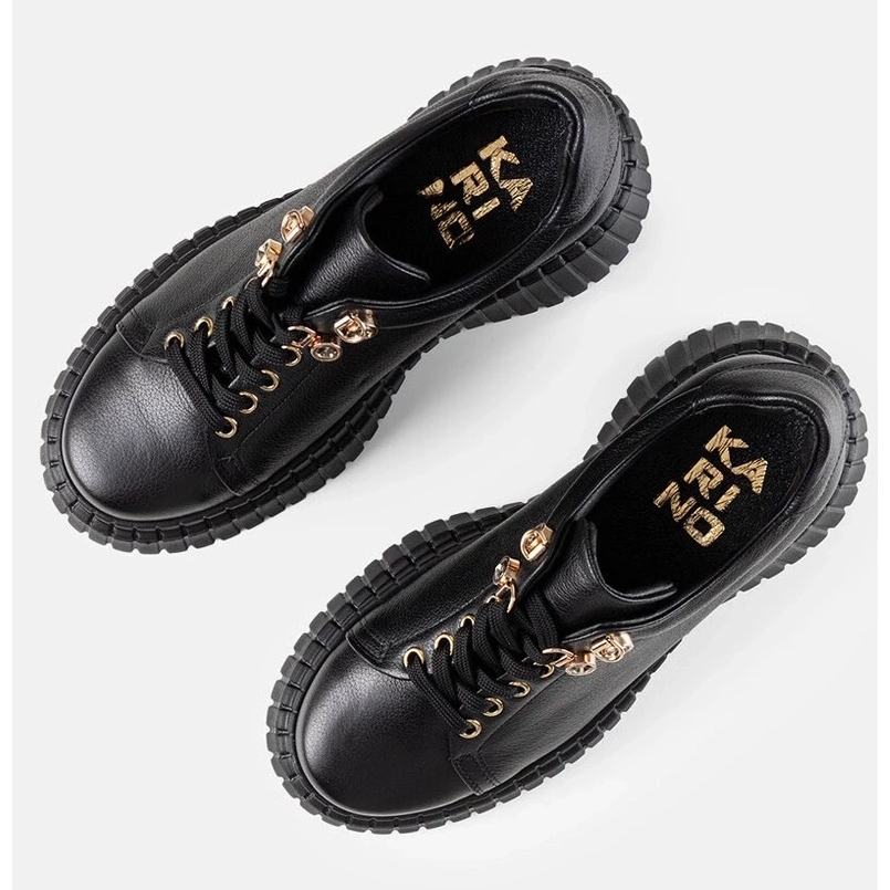 Adidașii din piele neagră de pe platforma Karino este un must-have absolut în fiecare garderobă pentru femei! Designul lor modern și nasul rotund îi fac să se încadreze perfect în tendințele actuale. Acești pantofi cu dantelă scăzută sunt o propunere ideală pentru zilele călduroase - confecționate din piele naturală de înaltă calitate, combinați stilul cu purtarea confortului.