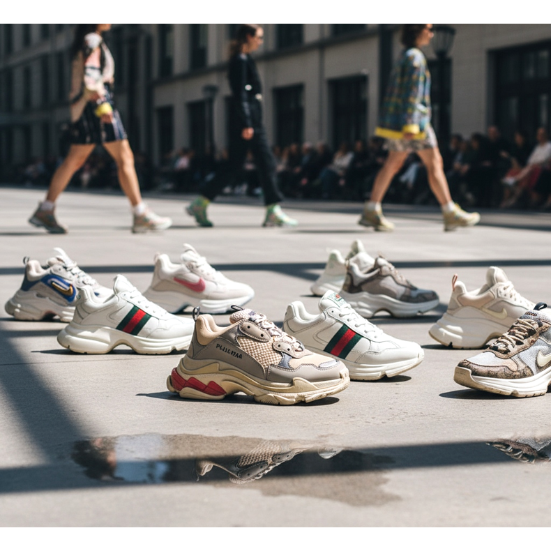 Tendința adidașilor groși a fost inițiată de marile case de modă. Balenciaga cu modelul său Triple S, Gucci cu Rhyton și Louis Vuitton cu Archlight au demonstrat că încălțămintea sport masivă poate fi luxoasă și de dorit. Curând, străzile din întreaga lume s-au umplut de femei în adidași cu platformă impresionanți.