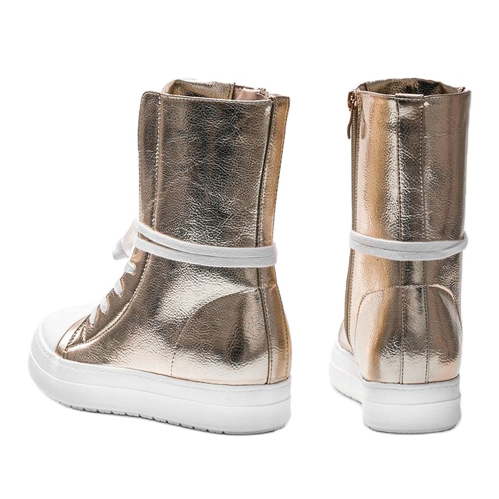 Vă prezentăm pantofi sportivi înalți exclusivi Fatima într-o culoare aurie încântătoare care cu siguranță vor atrage atenția fiecărui iubitor de modă. Realizați din piele ecologică de înaltă calitate, acești pantofi combină designul modern cu funcționalitatea. Finisajul lor metalic le confera un caracter unic, perfect pentru zilele de primavara si vara.