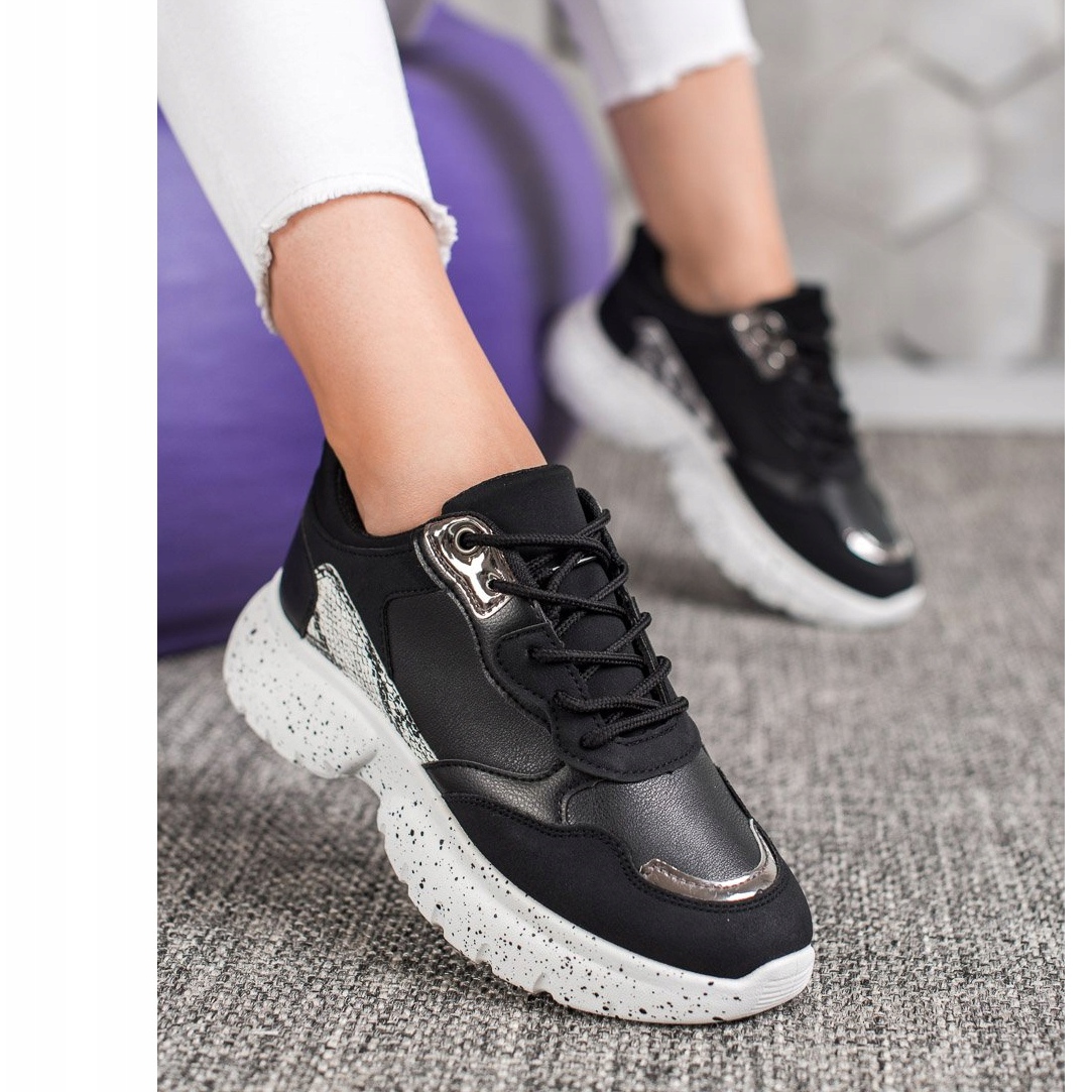 Adidașii negri McKeylor sunt alegerea perfectă pentru fiecare femeie care apreciază un aspect la modă și confortul de zi cu zi. Realizați din diverse tipuri de piele ecologică, acești pantofi combină stilul clasic cu accente moderne, precum mici inserții din piele de șarpe și detalii argintii care le conferă un caracter unic.