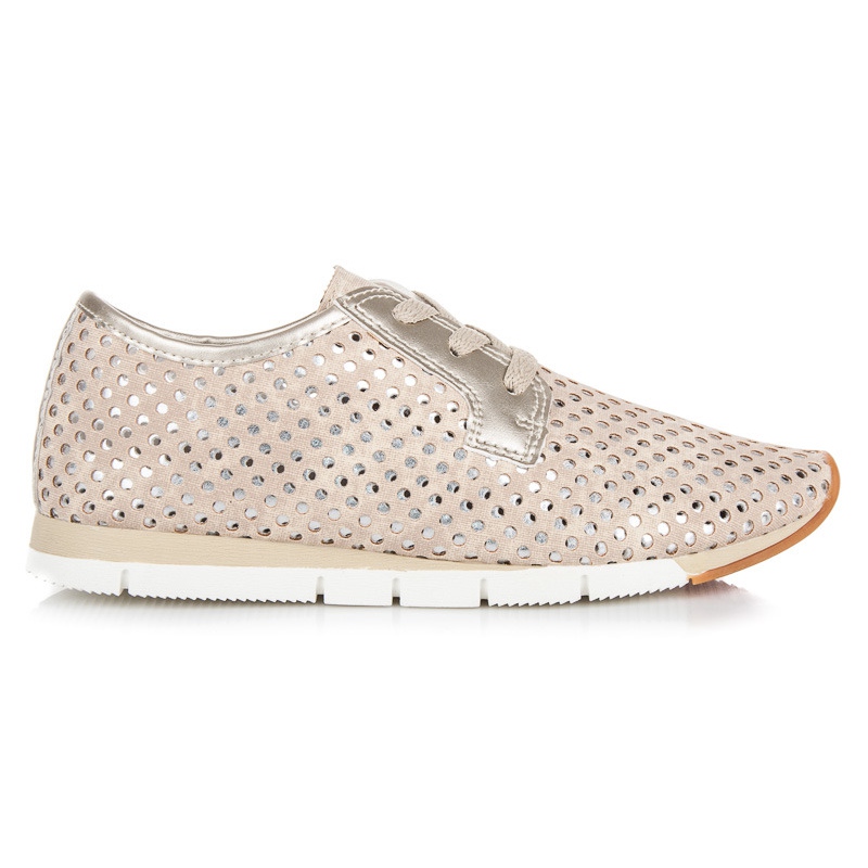 Adidașii sunt confecționați din piele ecologică de înaltă calitate, iar modelul lor ajurat le conferă originalitate și lejeritate. Culorile - o combinație armonioasă de galben, auriu, maro și bej - le fac să se potrivească cu multe ținute diferite. Interiorul pantofilor este căptușit cu material moale, care asigură confort chiar și atunci când sunt purtati perioade lungi de timp.