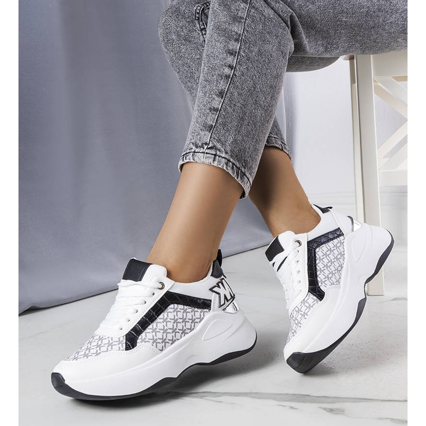 Partea superioară cu șireturi cu inserții suplimentare din material monograma atrage atenția și conferă un caracter original. Adidașii montați pe o talpă de cauciuc ridicată, înaltă de 4 cm, garantează confort și ușurință extraordinară în timpul utilizării. Datorită vârfului rotund și numerotării standard, acest model este extrem de confortabil, ceea ce îl face potrivit pentru purtarea pe tot parcursul zilei.