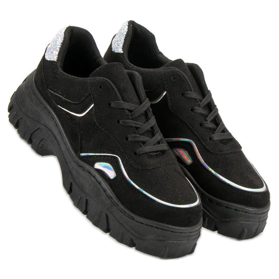 Platforma medie-înaltă, de 5 centimetri, într-o culoare neagră viu, absoarbe perfect șocurile, asigurând confort în timpul plimbărilor lungi. În plus, sclipiciul delicat și inserțiile strălucitoare le conferă un caracter unic, făcându-le un plus perfect pentru orice stil sportiv.