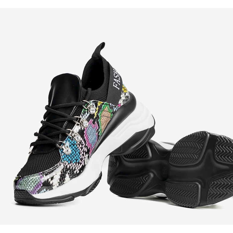 Adidașii Lissy sunt alegerea perfectă pentru femeile care apreciază moda și confort. Acești pantofi negri cu talpă înaltă încântă prin designul lor modern și prin lucrarea atentă. O talpă elegantă, înaltă, decorată cu inserții aurii, evidențiază perfect linia picioarelor, adăugându-le eleganță și caracter.