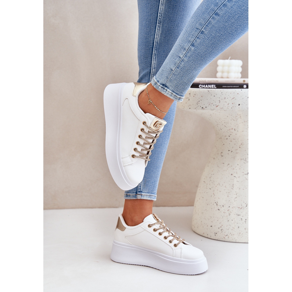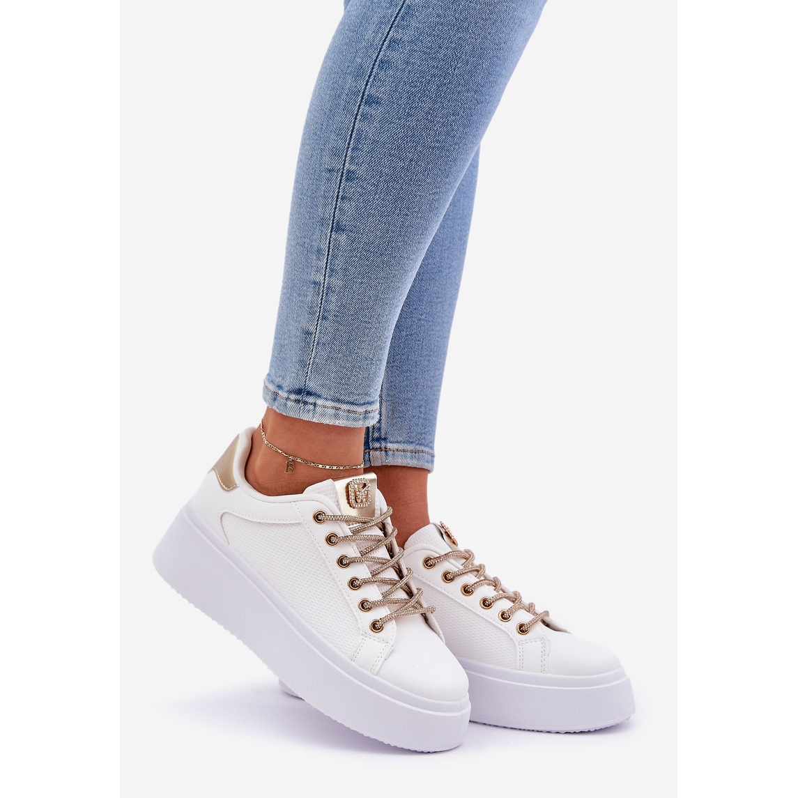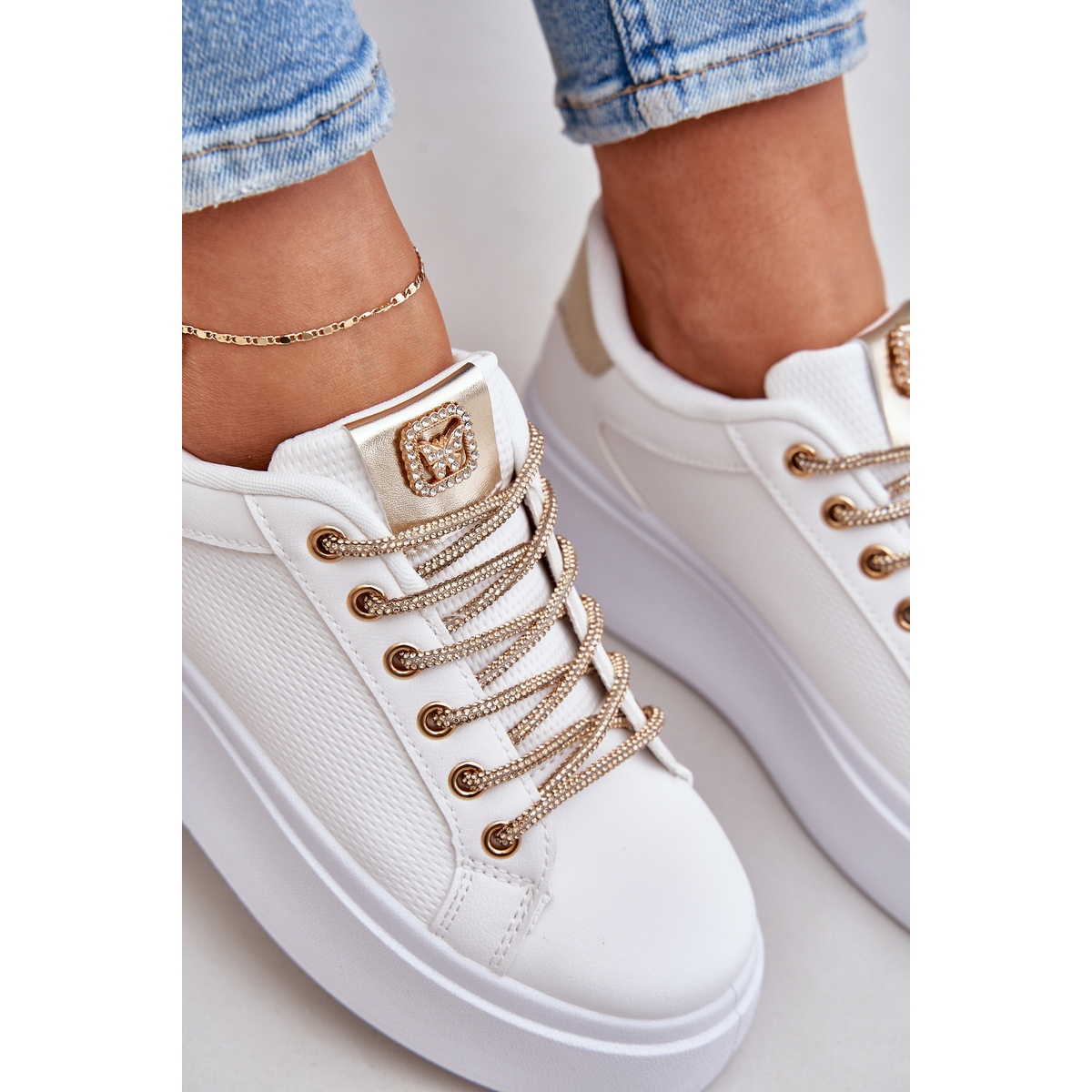 Detalii: Adidași pe o platformă cu șireturi decorative alb și auriu