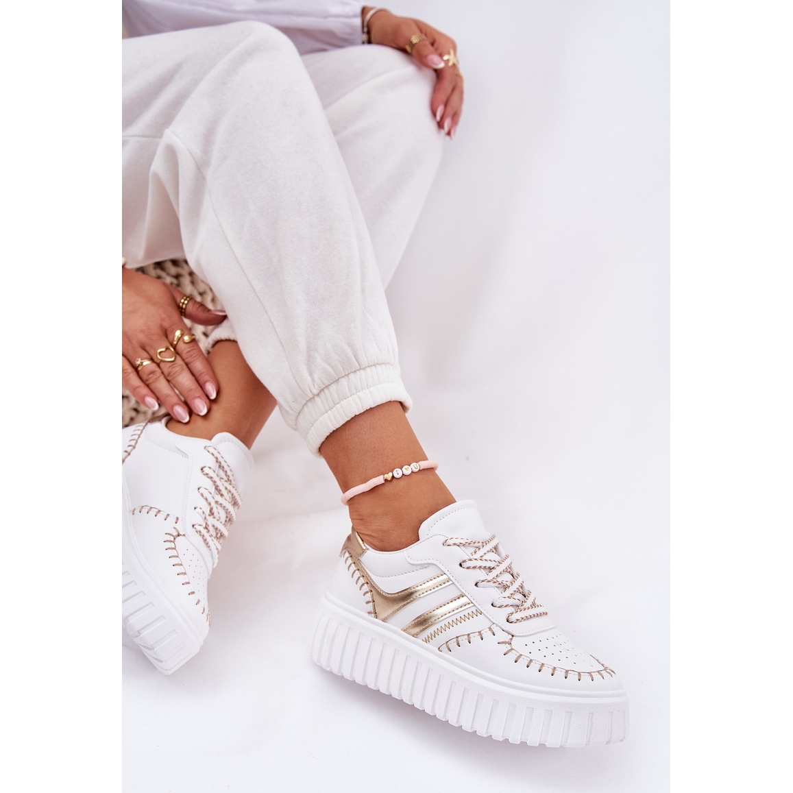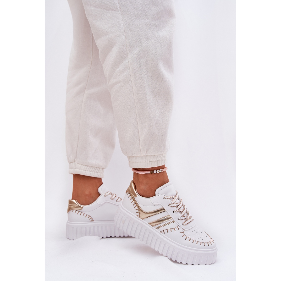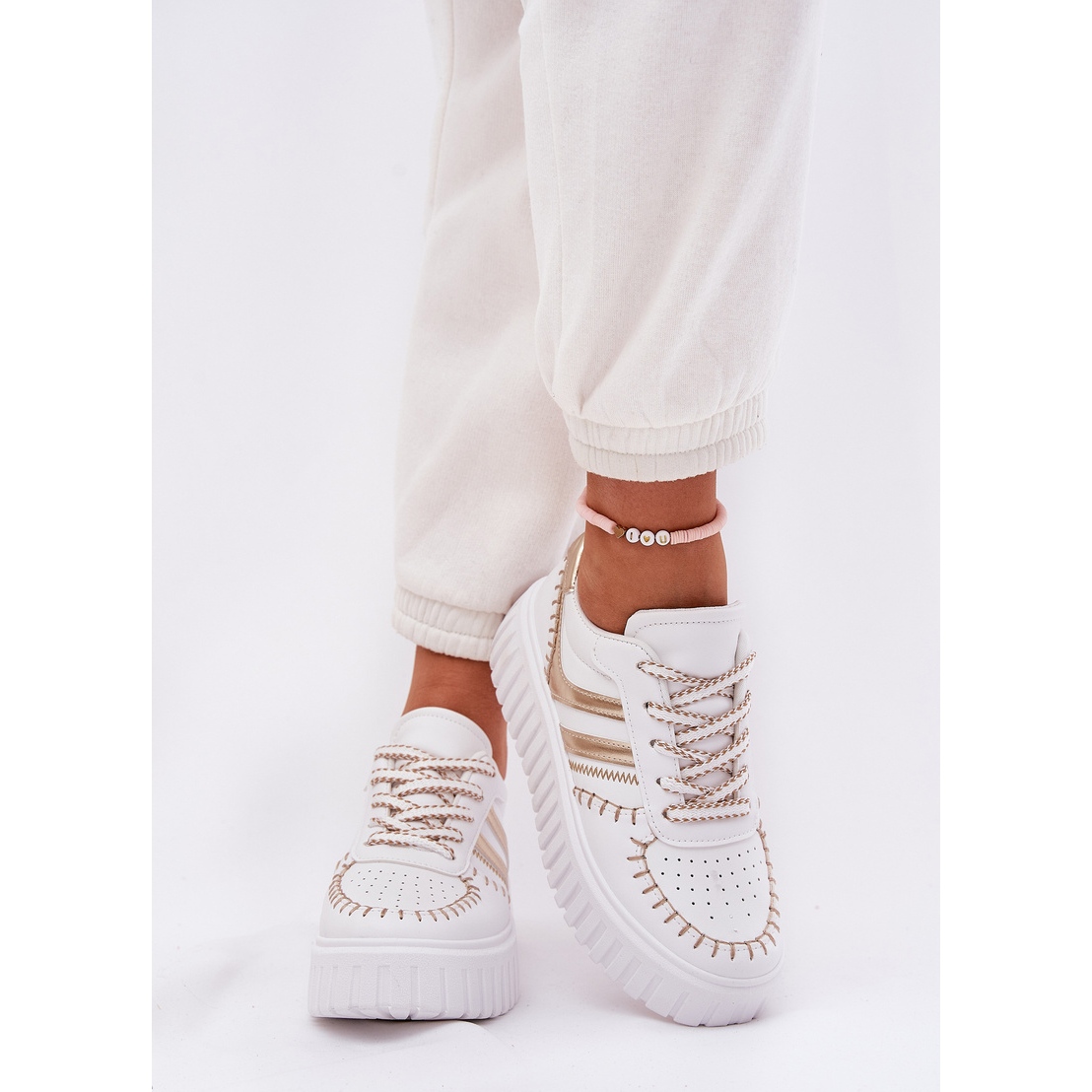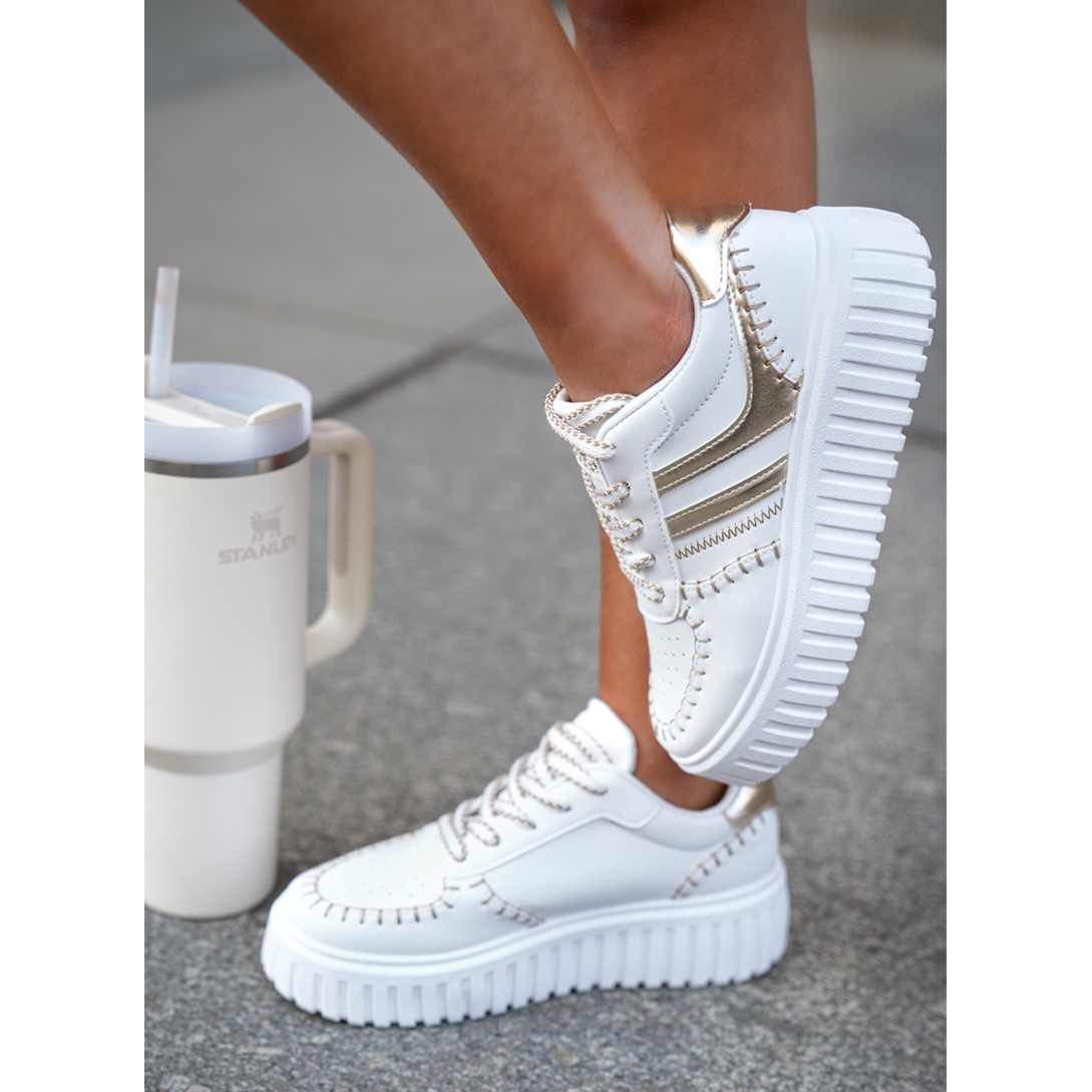 Descoperiți cea mai recentă tendință în pantofi cu adidași pentru femei pe platformă într -o culoare elegantă de aur. Acești pantofi eleganți din piele Eco de înaltă calitate combină designul modern cu un confort fără precedent. Situate pe o platformă de 4 centimetri, ele nu numai că adaugă optic creștere, dar, de asemenea, le pasă de confortul picioarelor tale, datorită inserției de spumă acoperită cu material moale care absoarbe la fiecare pas.