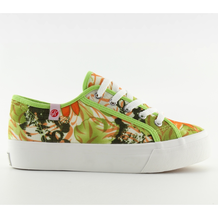 K145403 Tenisi multicolori cu talpa groasa - verzi, care imbina confortul cu aspectul la moda. Adidașii joasă, cu șireturi, pe o platformă albă atrăgătoare, înaltă de 3 cm, sunt o propunere perfectă pentru fiecare zi - la serviciu, la plimbare sau la întâlnire cu prietenii. Un model floral delicat și o culoare verde suculentă adaugă lejeritate și prospețime oricărui stil.