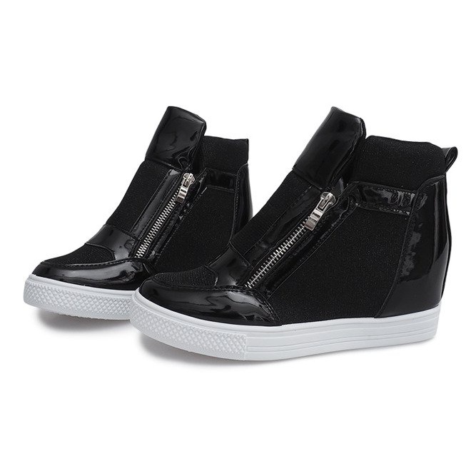 Adidașii cu pană TL020-2 în negru cu talpă albă sunt alegerea perfectă pentru femeile care doresc să îmbine confortul cu stilul elegant. Acești pantofi sport eleganti au o înălțime de aproximativ 6 cm, ceea ce nu numai că adaugă câțiva centimetri înălțime, dar și modelează frumos silueta.