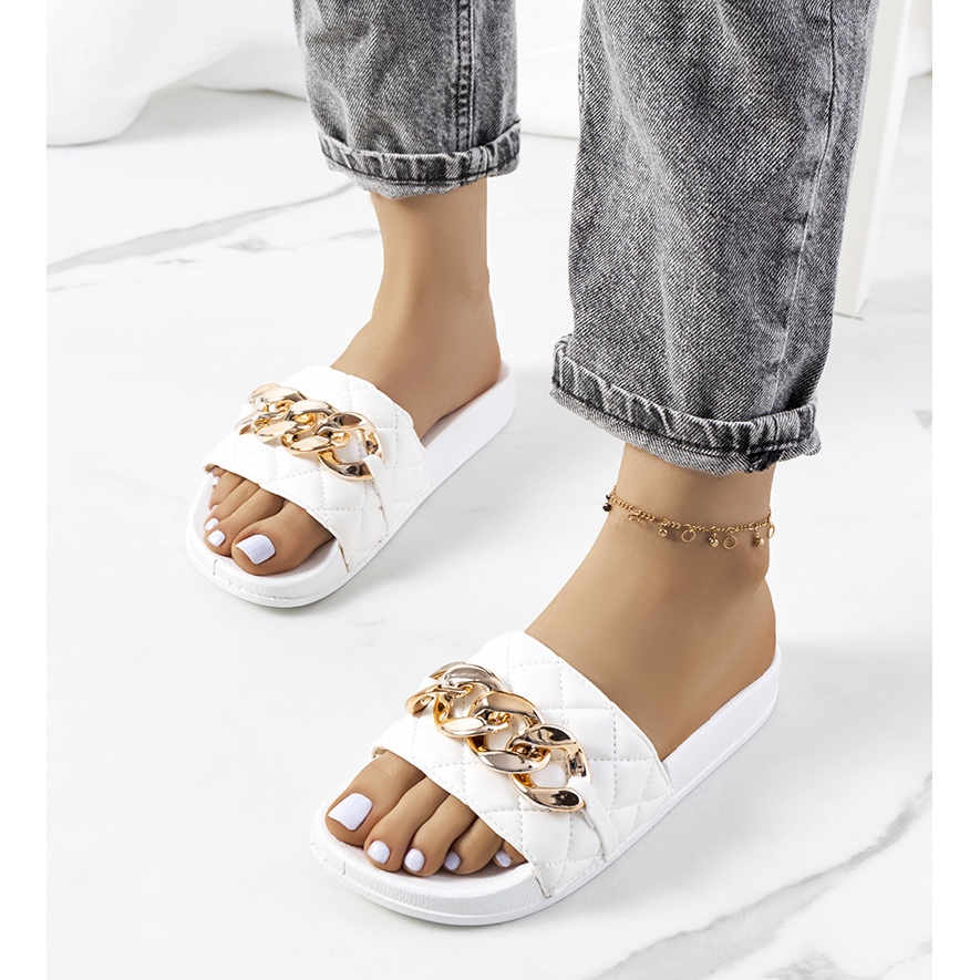 - **Estetică:** Degetul rotund și matlasarea subtilă conferă șlapilor un caracter elegant, iar lanțul de pe partea superioară adaugă o notă de modă.