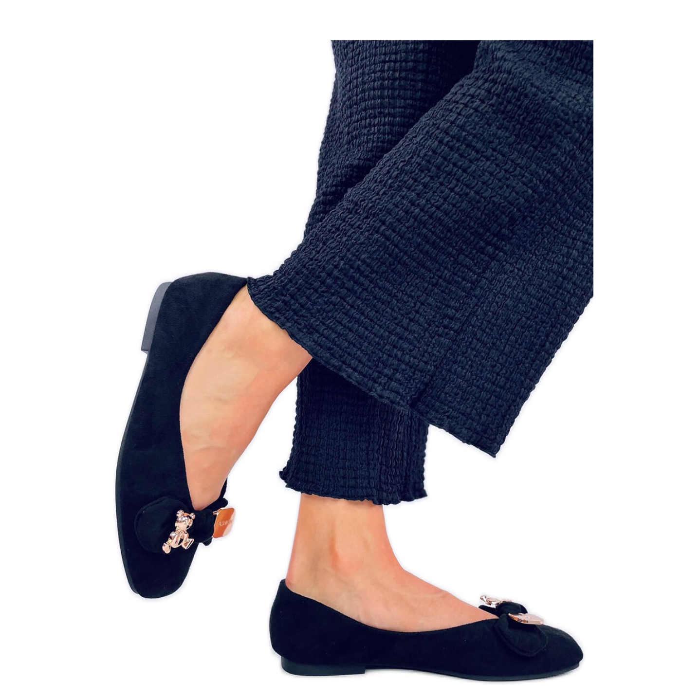 Balerina cu un urs de aur, negru, negru de la INELLO, este alegerea perfectă pentru femeile care apreciază stilul și confortul. Acești pantofi eleganți sunt din piele de căprioară ecologică, ceea ce le face nu numai ecologice, ci și durabile și ușor de îngrijit.