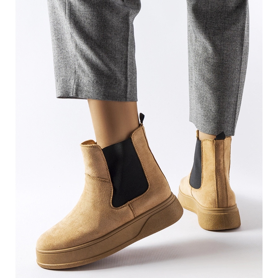 Produsul sunt cizme cu platformă bej închis. Cizmele sunt confectionate din piele intoarsa ecologica. Sunt slip-on, ceea ce adaugă un plus de practic și le face mai ușor de pus și scos. Sunt echipate cu un nas rotund, care adaugă eleganță și delicatețe. Înălțimea pantofilor a fost concepută în așa fel încât să prelungească optic picioarele.