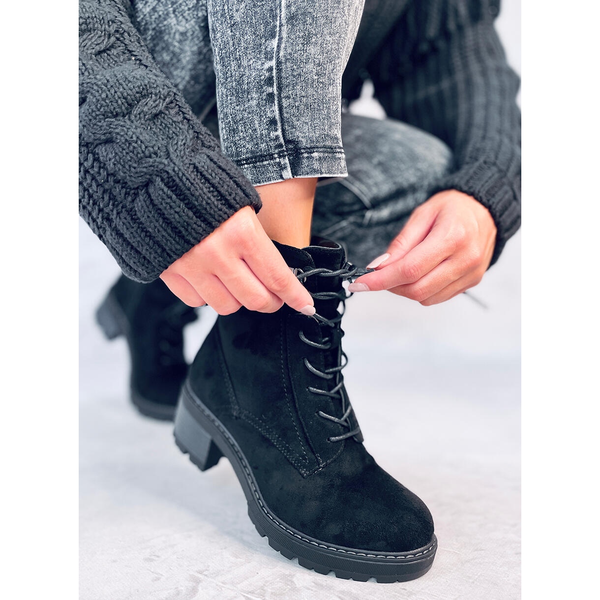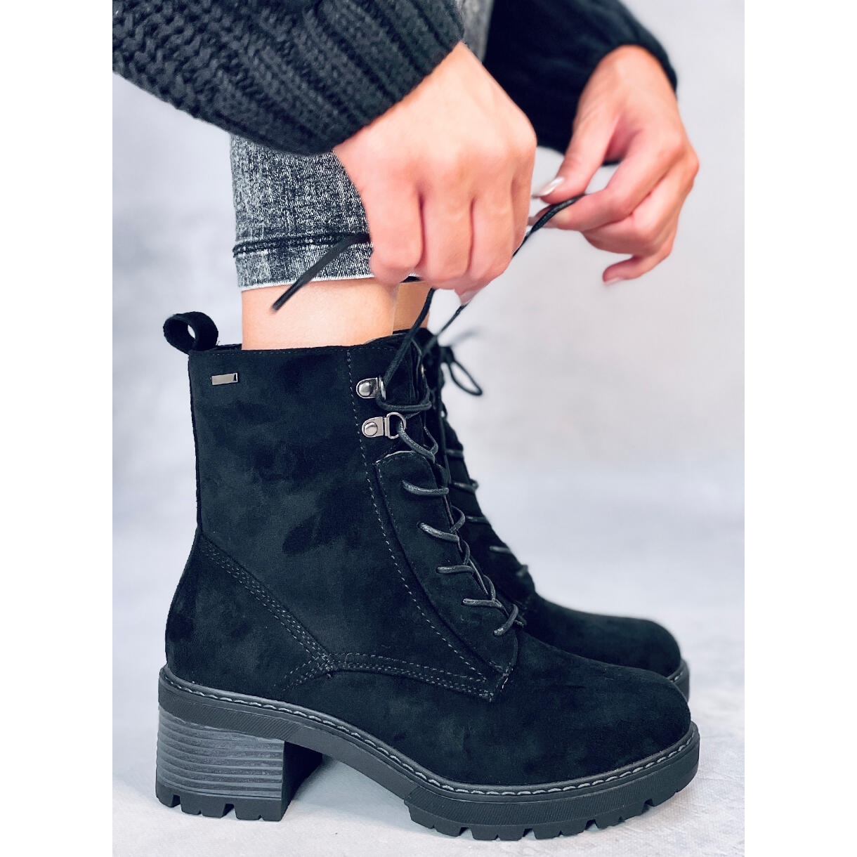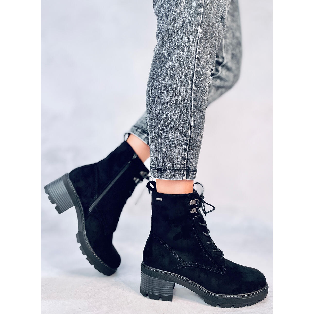Cizmele negre elegante, cu trestie neagră, combină o tăietură atemporală cu confortul de utilizare. Fabricate din piele de căprioară ecologică, cu blană delicată în interior, vor funcționa perfect în zile mai reci. Un călcâi bloc larg, stabil, cu o înălțime de 5,5 cm și un protector pe unicul garanție, un anumit pas, iar combinația de dantelă și o încuietoare practică facilitează să se potrivească și să se pună rapid.