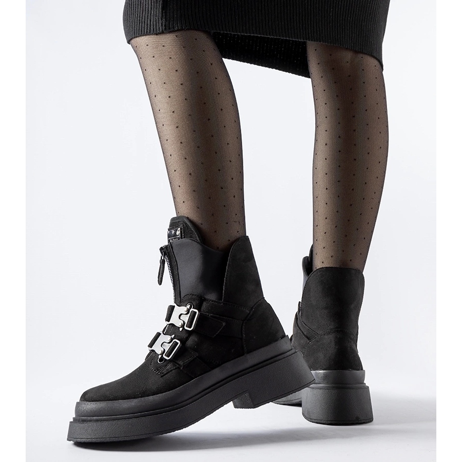 Cizmele sunt confectionate din piele intoarsa ecologica, care adauga un plus de eleganta. Talpa este realizată din cauciuc, care asigură durabilitate și contact bun cu solul, iar inserția din material mărește confortul la purtare.