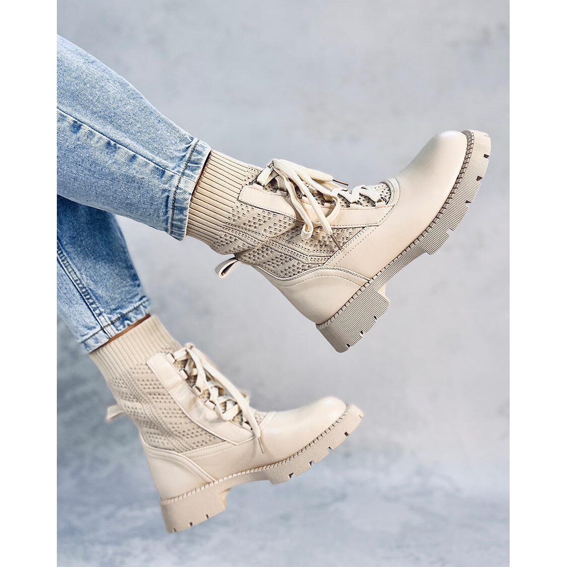 Cizmele sunt pantofi asemănător șosetei - au o parte superioară flexibilă, de pulover, care se potrivește perfect piciorului. Sunt decorate cu dantelă elegantă în față, care adaugă caracter. Culoarea bej permite o coafare ușoară.