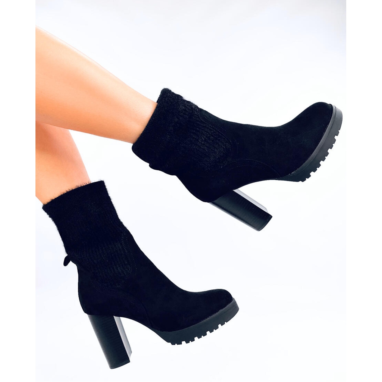 Descoperiți eleganța și confortul cu botine negre cu toc înalt și cu manșetă elastică. Aceste botine de dama din piele intoarsa cu inaltimea tocului de 10 cm si inaltimea platformei de 2 cm sunt combinatia perfecta de stil si confort, perfecte pentru orice situatie.