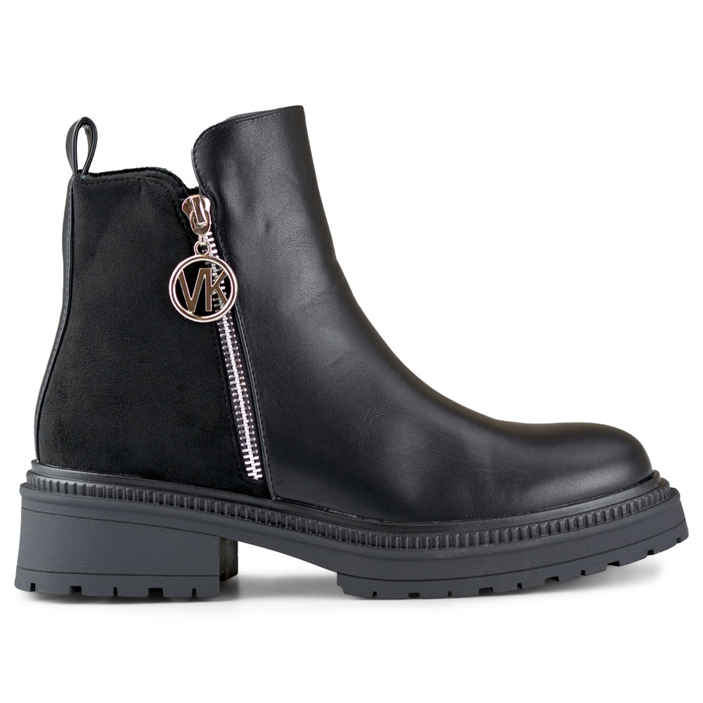 Cizme elegante, de gleznă neagră, cu o încuietoare decorativă, combinând un aspect la modă cu funcționalitatea. Fabricat din piele ecologică cu elemente de piele de căprioară ecologică, izolate cu o inserție de blană - perfectă pentru zile mai răcoroase. Platforma stabilă de 2,5 cm oferă un suport convenabil, menținând totodată un profil feminin.