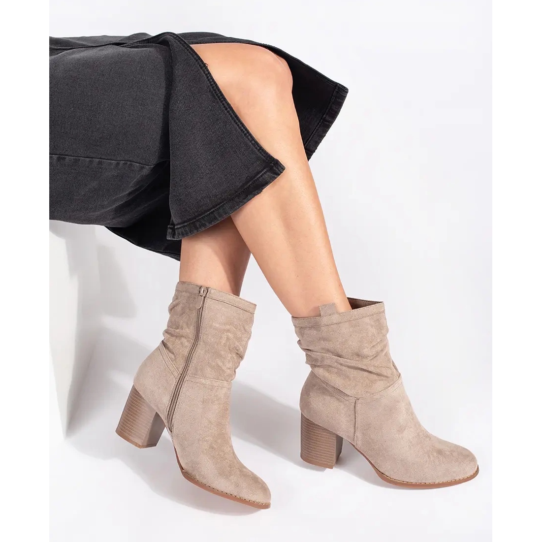 Prezentăm cizme pentru femei din piele de căprioară Beje pe o postare de la un brand de renume, care este un complement perfect pentru orice stilizare! Acest model, disponibil într -o nuanță elegantă de bej, a fost realizat din piele ecologică de înaltă calitate sub formă de piele de căprioară, ceea ce îi conferă un aspect modern și elegant.