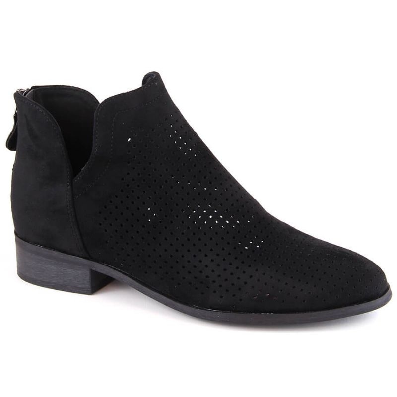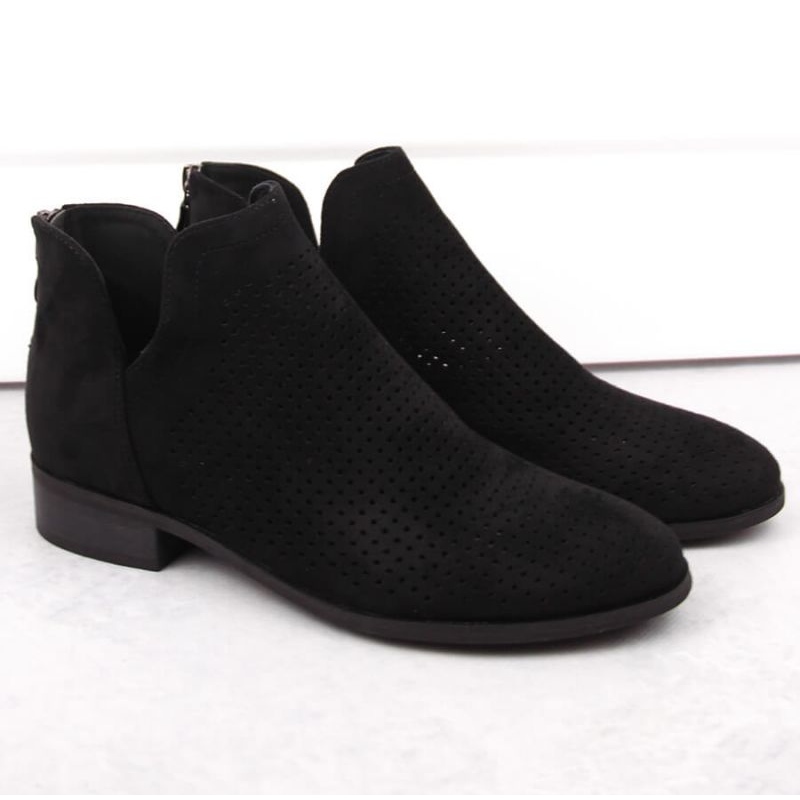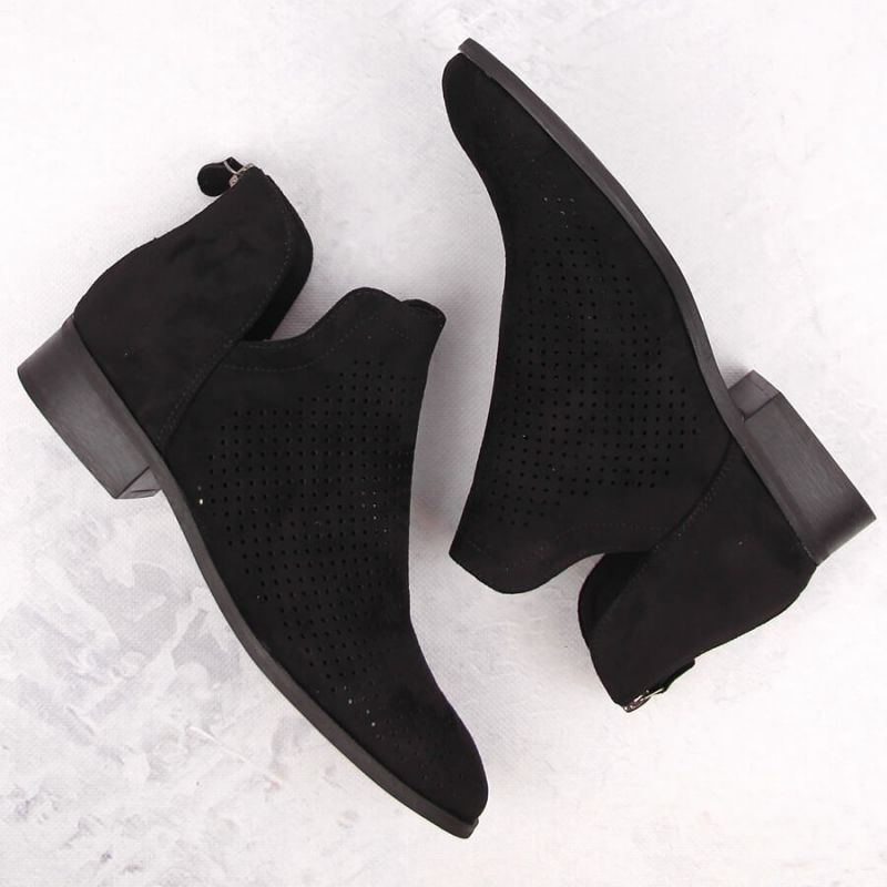 Cizmele superioare sunt decorate cu un model interesant deschis, care le oferă eleganță și le face să devină un complement perfect pentru orice stilizare. Calcul scăzut, cu o înălțime de 3 cm și înălțimea superioară atingând aproximativ 10 cm garantează stabilitate și confort în utilizarea de zi cu zi. Cizmele sunt fixate cu un fermoar practic, ceea ce face mai ușor să se pună și să decoleze.