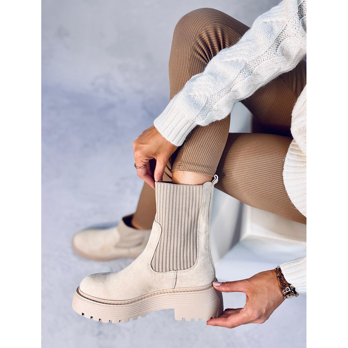 Faceți cunoștință cu Winters Beige Boots - Perfect pentru zile mai răcoroase, când doriți să arătați la modă și să vă simțiți confortabil. Combinația de piele de căprioară ecologică cu un superior flexibil, șoset creează un aspect unic și oferă o anumită potrivire a viței. Blana moale din interior garantează căldura, iar platforma masivă (înălțime de 5,5 cm) ridică subtil cifra, fără a renunța la comoditatea utilizării de zi cu zi.