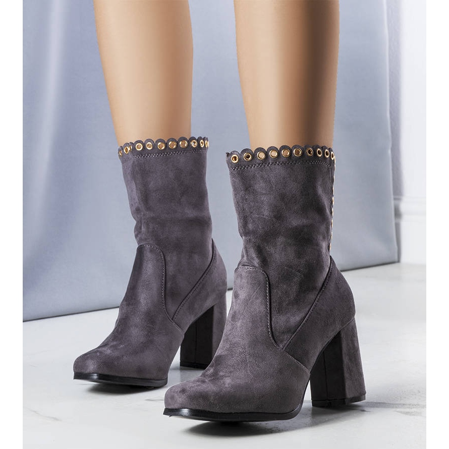 Cizme gri pe Ellianna Post - Eleganță și confort pentru zile mai răcoroase. Un nas clasic, rotund, combinat cu un călcâi solid, cum ar fi un post (8 cm) subțire optic figura, iar partea superioară care ajunge la gleznă (aproximativ 24 cm) se armonizează perfect cu o haină, fustă sau blugi. Finisat cu rinestone subtile care adaugă caracter oricărei stilizări.