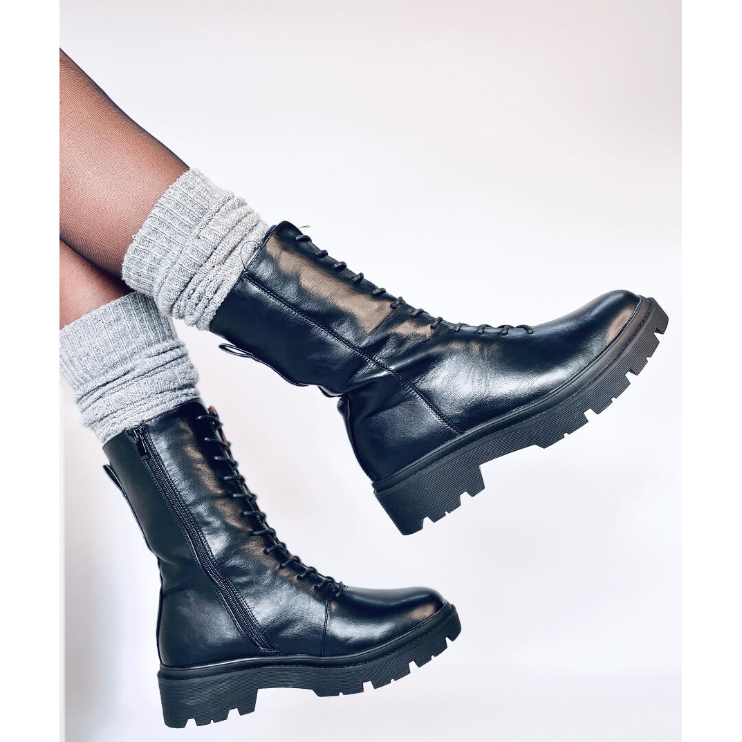 Produsul descris sunt botine de dama care sunt inalte, ajungand pana la glezna. Sunt realizate într-un stil militar, ceea ce le face perfecte pentru femeile active care apreciază confortul și comoditatea. Cizmele sunt negre și netede, fără niciun model dominant, așa că se potrivesc cu diverse stiluri. Sunt confectionate din piele ecologica, cu finisaj granulatie. Talpa ghetelor este sintetică.
