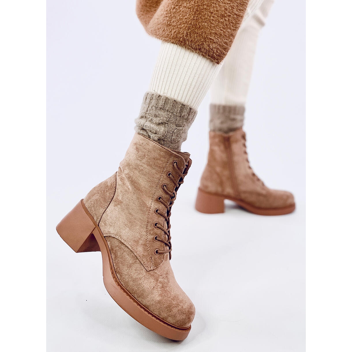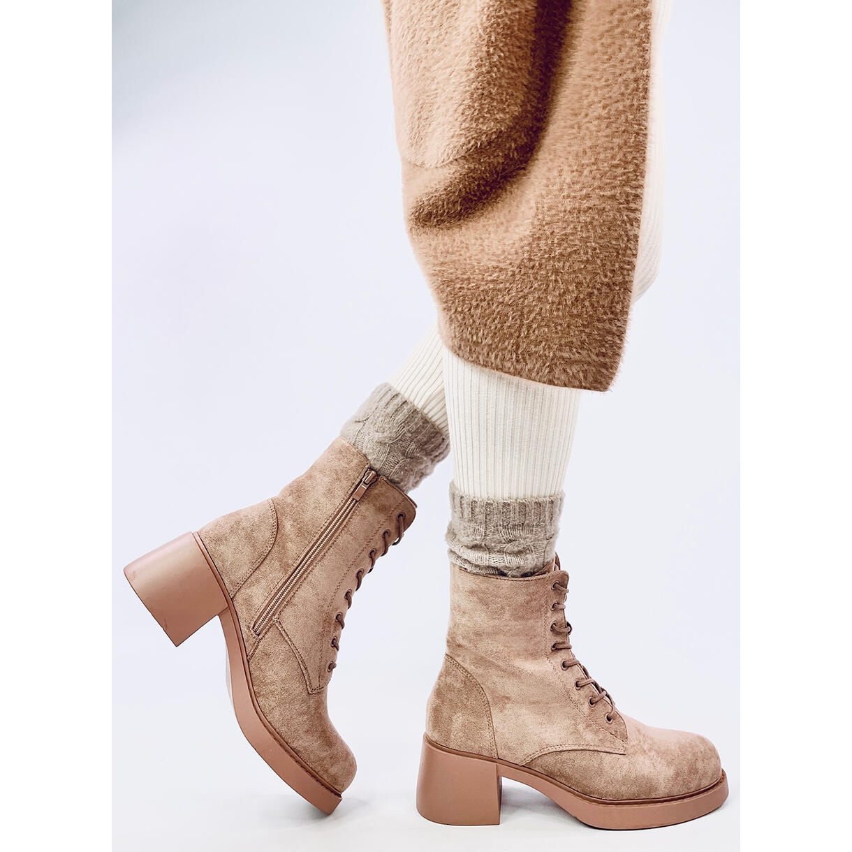 Descoperiți confort și stil excepțional cu botinele bej cu șireturi. Aceste botine elegante de damă au un toc lat de 6 cm înalt, care nu este doar la modă, ci și stabil, oferind suport adecvat pentru utilizarea de zi cu zi.