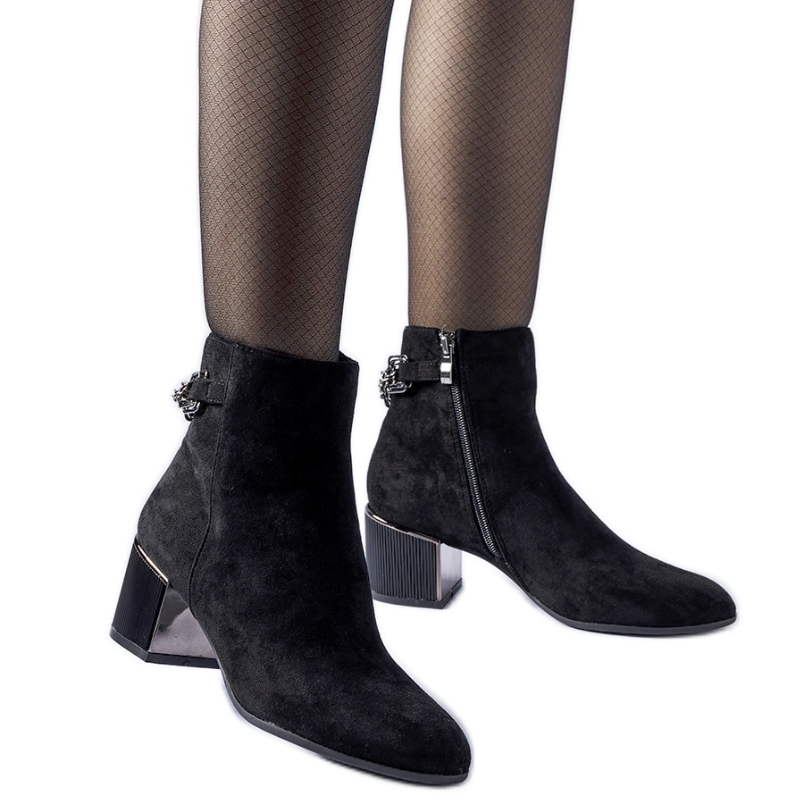 Cizme elegante, de gleznă neagră, din piele de căprioară ecologică. Izolat, cu un castel practic pe lateral și un lanț decorativ - ideal pentru sezonul de toamnă -vii pentru persoanele care caută încălțăminte la modă și confortabilă la un preț accesibil.
