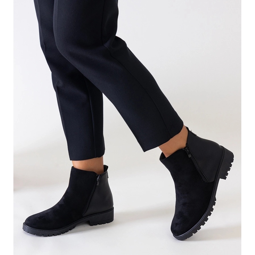 Cizmele de gleznă au un nas subțire, de migdale, care le oferă stil, iar culoarea lor neagră îi face să se potrivească cu multe ținute. Calcul plat de 3,5 cm vă permite să vă deplasați confortabil pe parcursul zilei, ceea ce le face o alegere excelentă atât pentru stilizări de zi cu zi, cât și pentru mai elegante.