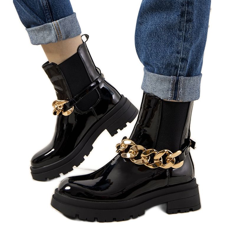 Descoperiți noua noastră propunere pentru toamnă și iarnă - botine negre lacuite cu lanț Tapia. Aceste botine uimitoare combină eleganța cu designul modern. Realizate din piele lacuita de inalta calitate si decorate cu un lant auriu, atrag atentia si sunt o completare perfecta a oricarei tinute.