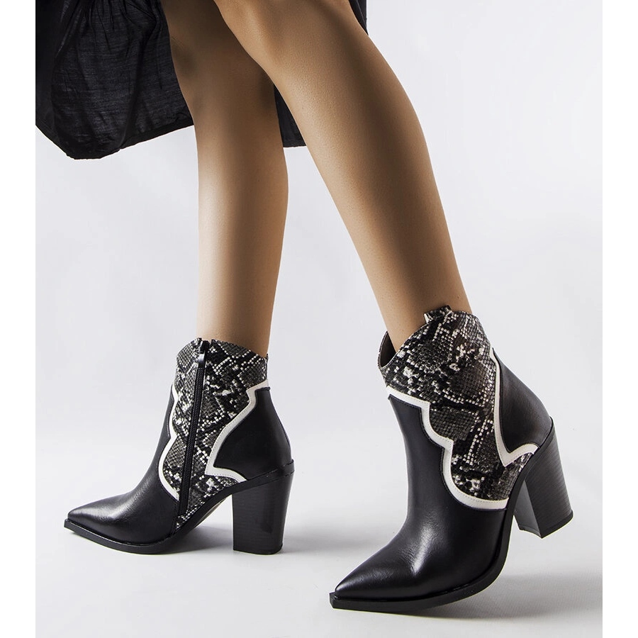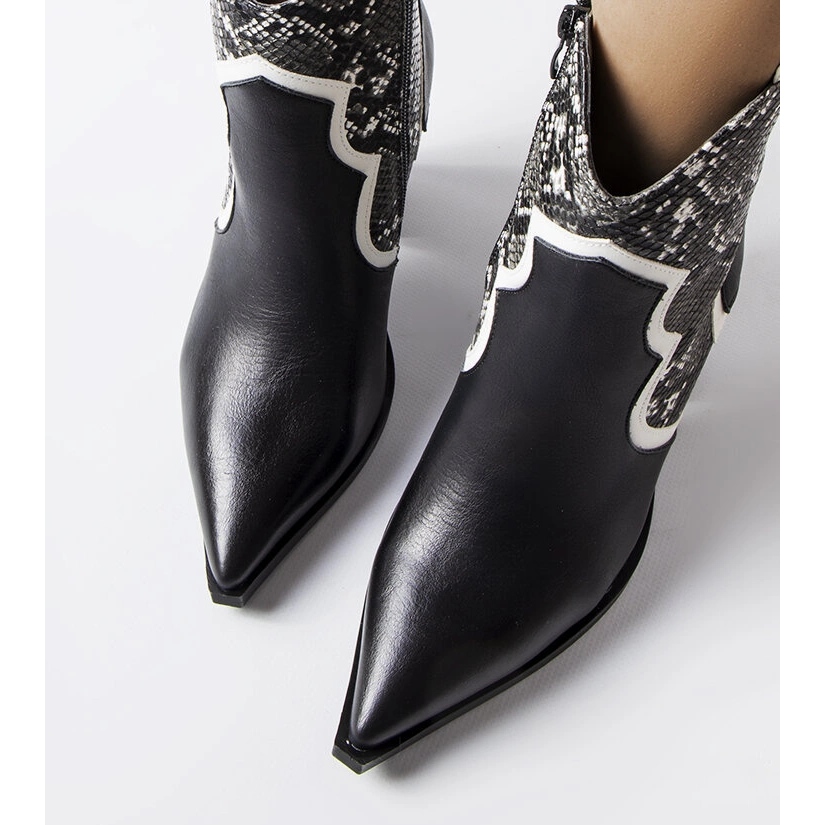 Cizmele negre pentru femei de la "Boutes Inna" sunt alegerea perfecta pentru zilele de toamna si iarna. Modelul marcat in catalog ca GD-FL2046 este un produs de inalta calitate, din piele ecologica. Atât culoarea principală, cât și culoarea tălpii sunt negre. In plus, cizmele au accente albe. O trăsătură caracteristică a modelului este un toc înalt sub formă de stâlp cu o înălțime de 9 cm, care, combinat cu înălțimea întregului pantof de 20 cm, oferă un efect elegant și modern.