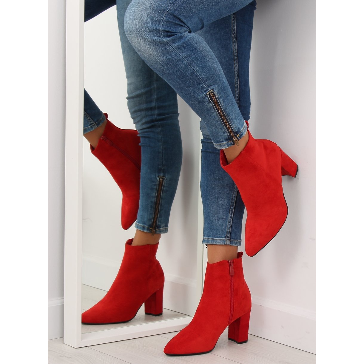 Redescoperă clasicii cu botine roșii cu toc stabil! Perfecte pentru femeile care doresc să îmbine eleganța cu confortul, aceste botine sunt un must-have în fiecare garderobă. Realizate din piele intoarsa ecologica de inalta calitate, arata extrem de stilat, iar tocul lor bloc inalt de 8 cm alungeste frumos picioarele.