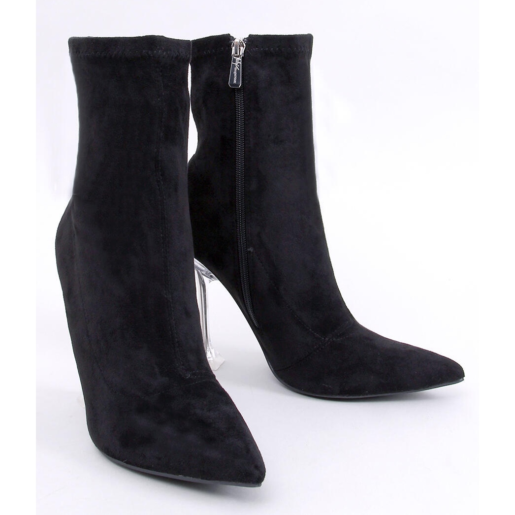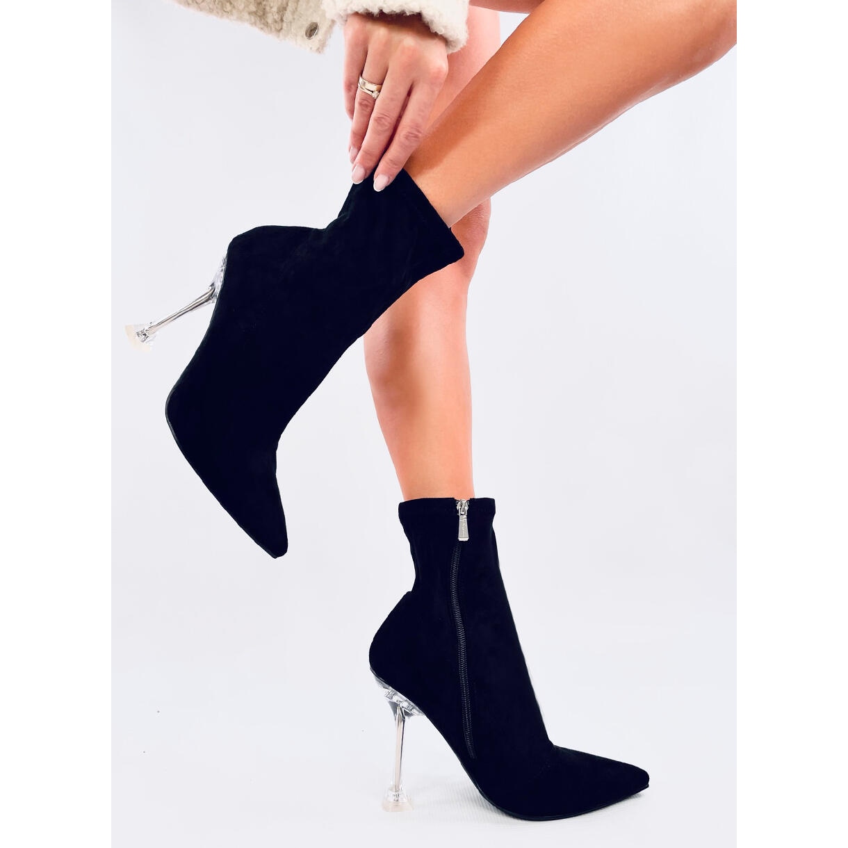 Botinele pentru femei sunt pantofi eleganti, negri, din piele intoarsa, cu un stiletto inalt, transparent, inalt de 11,5 cm. Călcâiul adaugă grație siluetei și atrage atenția. Modelul se caracterizează printr-o croială îngrijită cu degetele ușor ascuțite. Pantofii sunt prevazuti cu fermoar, ceea ce ii face mai usor de incaltat. Nu au izolare, deci sunt perfecte pentru anotimpurile mai calde.