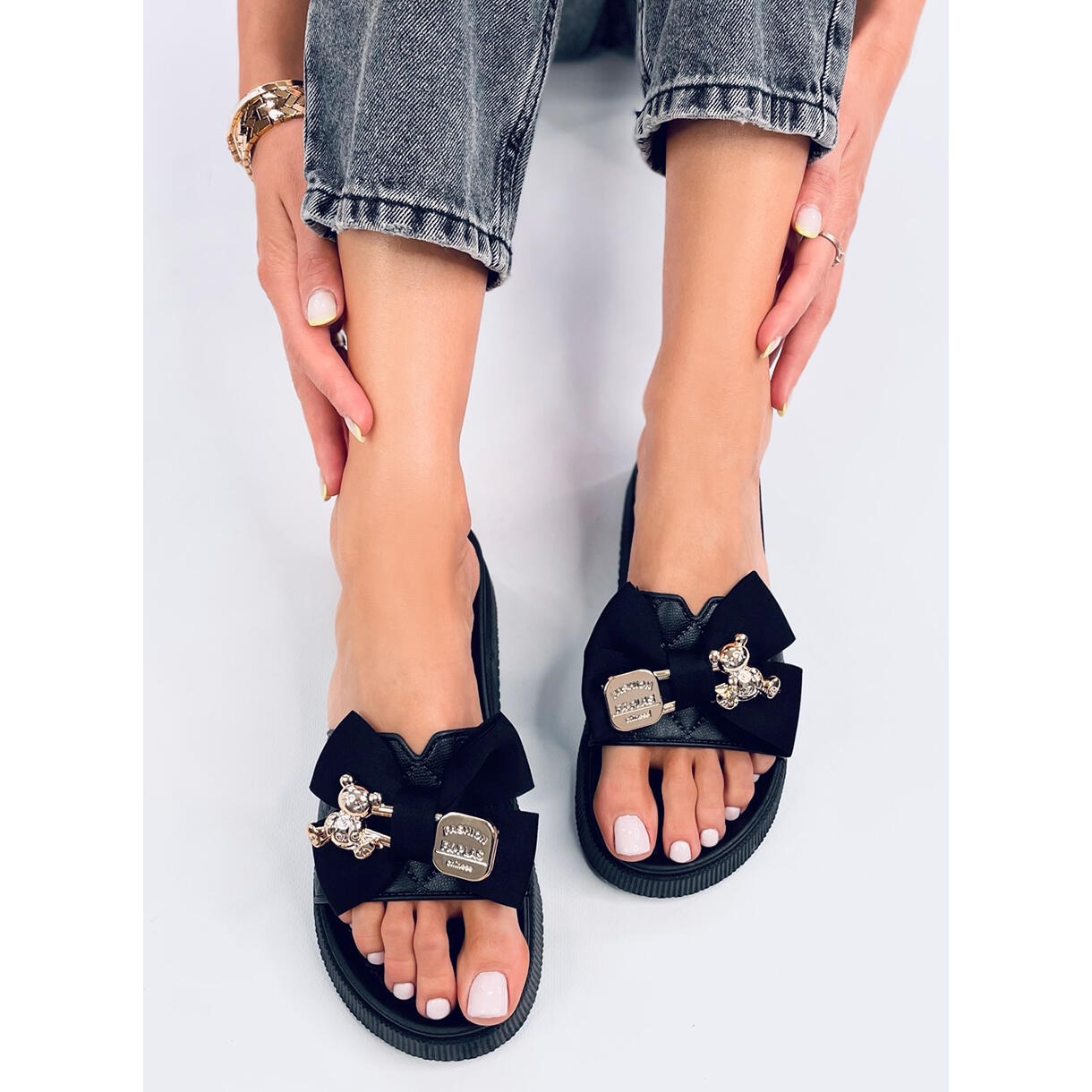 Acești papuci netezi fără deget de la picior sunt un adevărat must-have în garderoba oricărei femei. Cu ajutorul lor, vei crea ținute elegante și confortabile atât pentru plimbări, cât și pentru întâlniri cu prietenii. Nu așteptați - lăsați șlapii Brandis Black cu ursuleț auriu să vă fure inima și să vă completeze colecția de încălțăminte de zi cu zi!