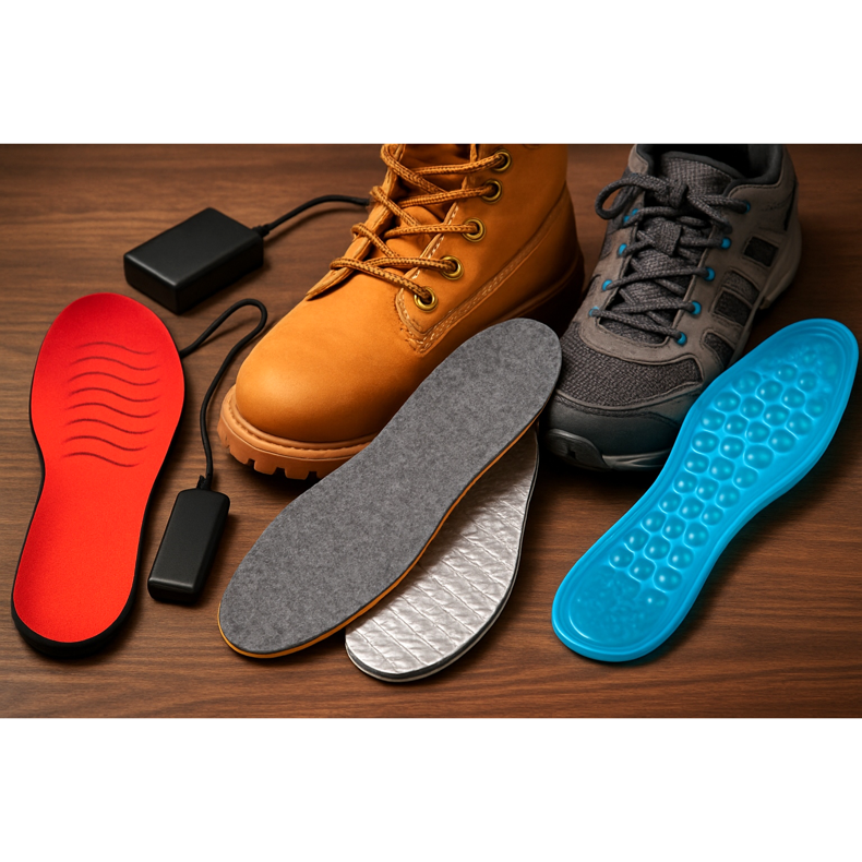 Branțurile încălzite, alimentate de o baterie sau încărcate prin USB, îți mențin picioarele calde în timpul înghețurilor. Acestea oferă diferite niveluri de încălzire (de obicei 3-5 nivele), timp de funcționare de la 4 la 10 ore. Perfect pentru activități în aer liber, muncă la rece și sporturi de iarnă. Inserțiile termoizolante realizate din materiale precum lâna, Thinsulate, aluminiul reflectă căldura corpului și rețin pasiv căldura. Mai ușor, mai ieftin, nu necesită încărcare. Excelent pentru pantofi de trekking de iarnă și ghete de lucru. Branțurile răcoritoare cu gel răcoritor oferă ușurare în zilele caniculare, reduc transpirația și previn supraîncălzirea picioarelor. Reactivat la frigider. Perfect pentru curieri și muncitori în construcții vara.