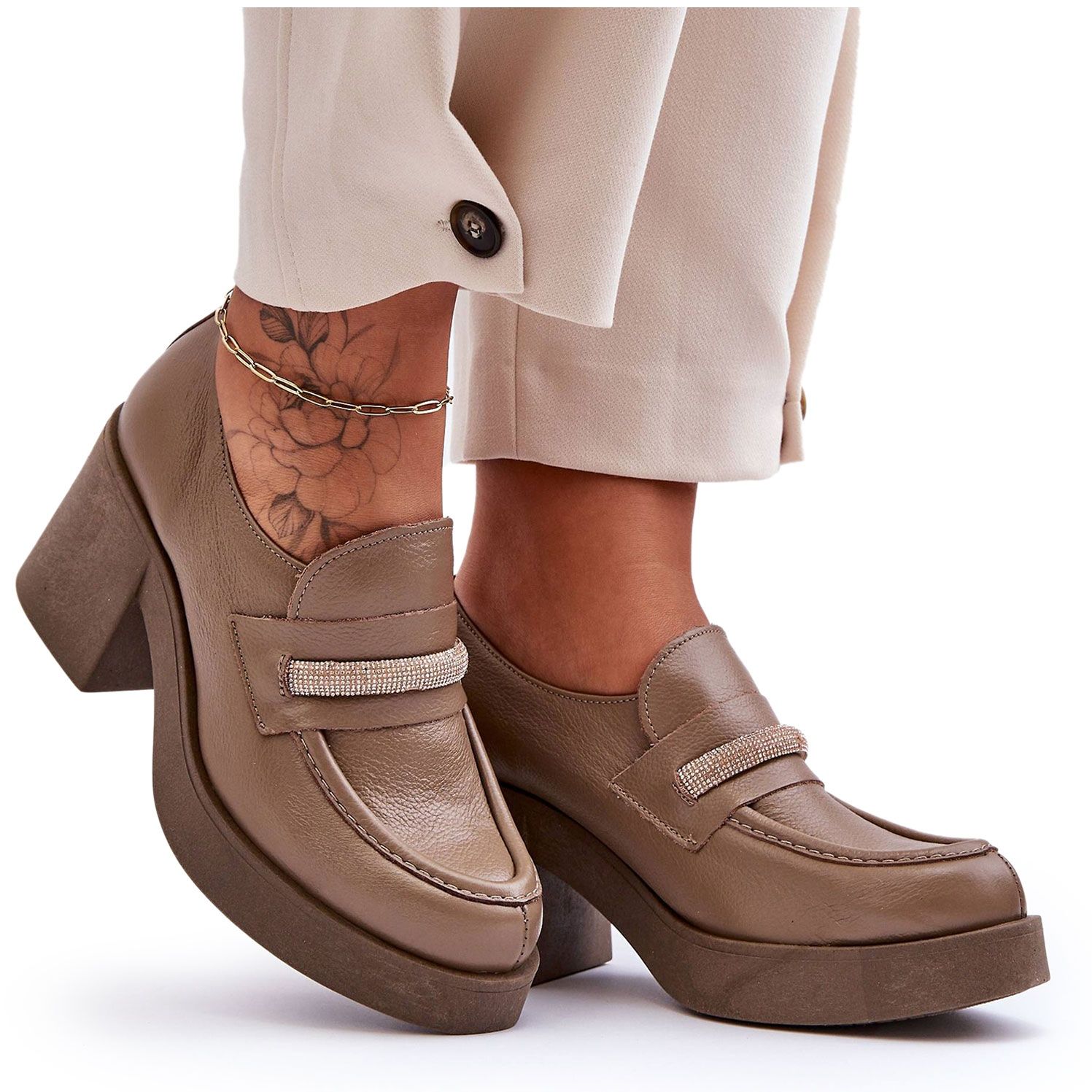 Încălțăminte din piele Lemar pe postare cu un ornament - Dark Beige (V. Fango)