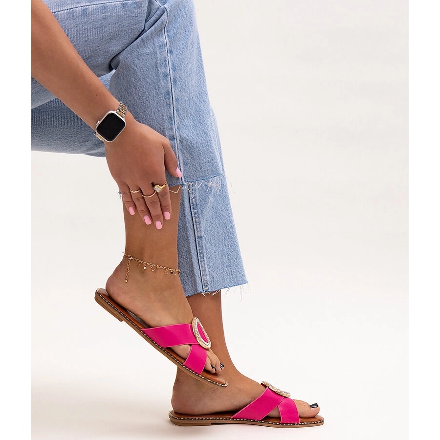 Papucii decorați cu o cataramă în strasurile Salimba în roz sunt alegerea perfectă pentru zilele de vară care combină confortul cu stilul la modă. Designul lor de alunecare permite punerea rapidă și convenabilă, ceea ce îi face însoțitori excelenți în timpul plimbărilor de vacanță sau relaxare pe plajă. Nasul rotund oferă clapelor un aspect modern, care cu siguranță îți va atrage ochii.