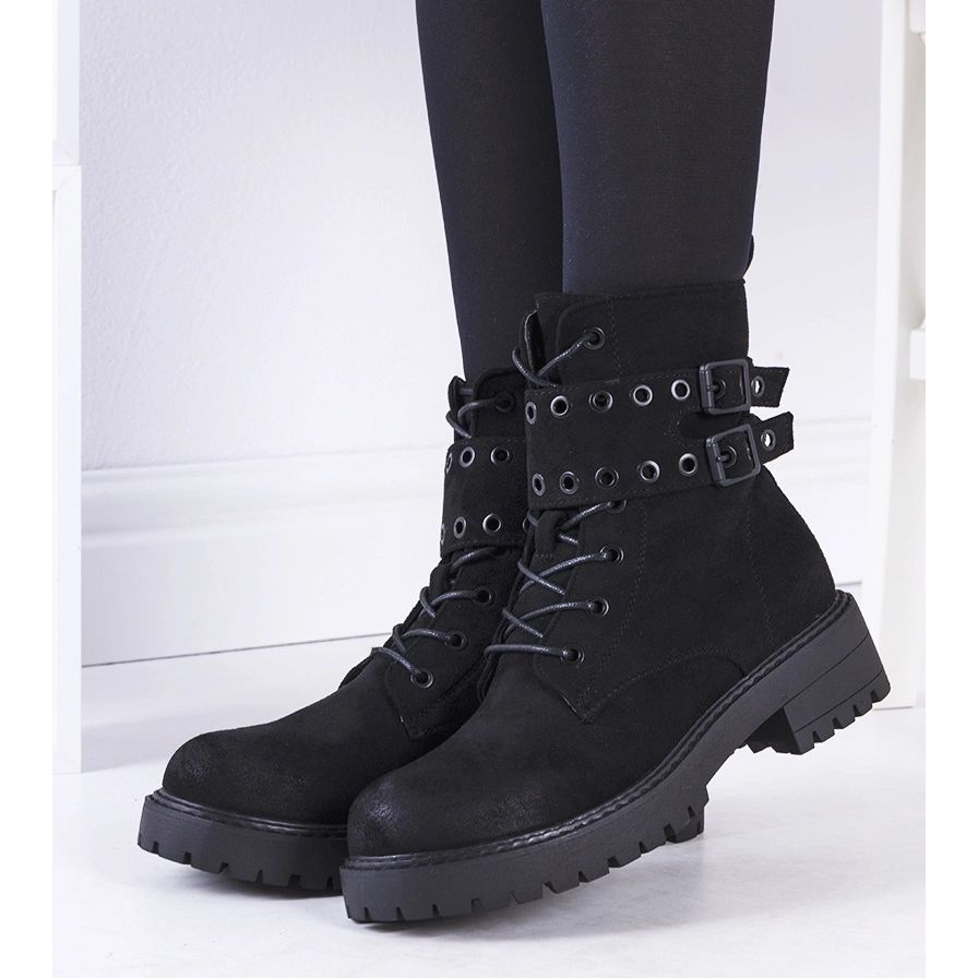 Capcanii clasici, negri Fallkirk, sunt o combinație de comoditate și un stil la modă, brut. Situate pe o talpă de plastic groasă, protejată, cu nas rotunjit și o curea decorativă cu catarame, sunt perfecte pentru stilizări casual zilnice. Partea superioară din piele ecologică din piele de căprioară, interior izolat - perfect pentru sezonul de toamnă/iarnă.